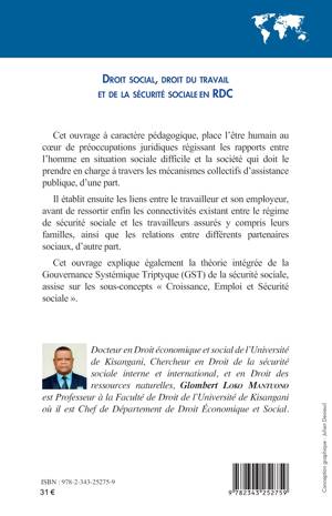 Cet ouvrage à caractère pédagogique, place l’être humain au coeur de préoccupations juridiques régissant les rapports entre l’homme en situation sociale difficile et la société qui doit le prendre en charge à travers les mécanismes collectifs d’assistance publique, d’une part. Il établit ensuite les liens entre le travailleur et son employeur, avant de ressortir enfin les connectivités existant entre le régime de sécurité sociale et les travailleurs assurés y compris leurs familles, ainsi que les relations entre différents partenaires sociaux, d’autre part. Cet ouvrage explique également la théorie intégrée de la Gouvernance Systémique Triptyque (GST) de la sécurité sociale, assise sur les sous-concepts « Croissance, Emploi et Sécurité sociale ».