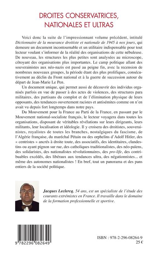 Voici la suite du Dictionnaire de la mouvance droitiste et nationale de 1945 à nos jours. Ce document analyse le camp politique allant des souverainistes aux néo-nazis, il recense de nombreux nouveaux groupes, la période étant des plus prolifiques, consécutivement au déclin du Front national et à la guerre de succession autour du départ de Jean-Marie Le Pen. Du mouvement pour la France au Parti de la France, en passant par le Mouvement national-socialiste français, le lecteur voyage dans toutes les organisations, disposant de révélations sur leurs dirigeants, leurs militants, leur localisation et idéologie.
