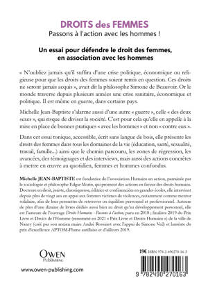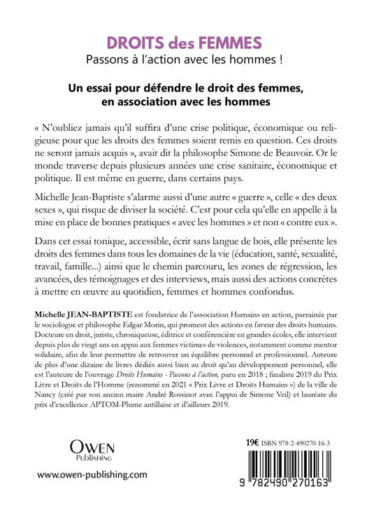 Un essai pour défendre le droit des femmes, en association avec les hommes « N’oubliez jamais qu’il suffira d’une crise politique, économique ou religieuse pour que les droits des femmes soient remis en question. Ces droits ne seront jamais acquis », avait dit la philosophe Simone de Beauvoir. Or le monde traverse depuis plusieurs années une crise sanitaire, économique et politique. Il est même en guerre, dans certains pays. Michelle Jean-Baptiste s’alarme aussi d’une autre « guerre », celle « des deux sexes », qui risque de diviser la société. C’est pour cela qu’elle en appelle à la mise en place de bonnes pratiques « avec les hommes » et non « contre eux ». Dans cet essai tonique, accessible, écrit sans langue de bois, elle présente les droits des femmes dans tous les domaines de la vie (éducation, santé, sexualité, travail, famille...) ainsi que le chemin parcouru, les zones de régression, les avancées, des témoignages et des interviews, mais aussi des actions concrètes à mettre en oeuvre au quotidien, femmes et hommes confondus. Michelle JEAN-BAPTISTE est fondatrice de l’association Humains en action, parrainée par le sociologue et philosophe Edgar Morin, qui promeut des actions en faveur des droits humains. Docteure en droit, juriste, chroniqueuse, éditrice et conférencière en grandes écoles, elle intervient depuis plus de vingt ans en appui aux femmes victimes de violences, notamment comme mentor solidaire, afin de leur permettre de retrouver un équilibre personnel et professionnel. Auteure de plus d’une dizaine de livres dédiés aussi bien au droit qu’au développement personnel, elle est l’auteure de l’ouvrage Droits Humains - Passons à l’action, paru en 2018 ; finaliste 2019 du Prix Livre et Droits de l’Homme (renommé en 2021 « Prix Livre et Droits Humains ») de la ville de Nancy (créé par son ancien maire André Rossinot avec l’appui de Simone Veil) et lauréate du prix d’excellence APTOM-Plume antillaise et d’ailleurs 2019.