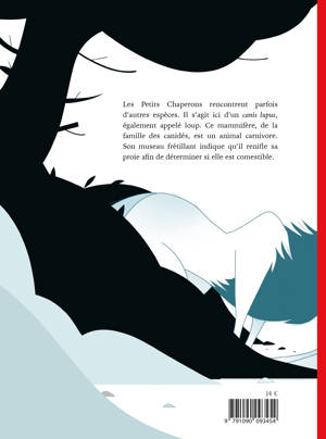 Les Petits Chaperons rencontrent parfois d'autres espèces. Il s'agit ici d'un Canis lupus, également appelé loup. Ce mammifère, de la famille des canidés, est un animal carnivore. Son museau frétillant indique qu'il renifle sa proie afin de déterminer si elle est comestible. Construit comme un livre animalier, l'ouvrage étudie le Petit Chaperon rouge, sa morphologie, son environnement, ses habitudes avec beaucoup d'humour. Ce livre plaira autant aux parents qu'aux enfants, pour une lecture partagée dans la bonne humeur !