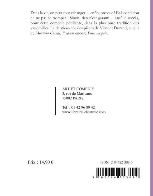 Dans la vie, on peut tout échanger... enfin, presque ! Et à condition de ne pas se tromper ! Sinon, rien n'est garanti... sauf le succès, pour cette comédie pétillante, dans la plus pure tradition des vaudevilles. La dernière-née des pièces de Vincent Durand, auteur de Monsieur Claude, Fred ou encore Filles au pair.