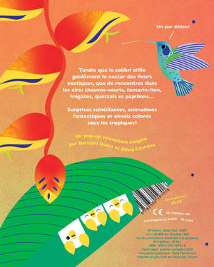 Tandis que le colibri siffle goulûment le nectar des fleurs exotiques, que de rencontres dans les airs : chauves-souris, tamarin- lion, frégates, quetzals et papillons... Un pop-up virevoltant imaginé par Bernard Duisit et Olivia Cosneau ! Au programme, surprises scintillantes, animations fantastiques et envols colorés sous les tropiques !
