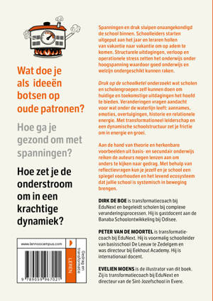 Wat doe je als ideeën botsen op oude patronen? Hoe ga je gezond om met spanningen? Hoe zet je de onderstroom om in een krachtige dynamiek? Spanningen en druk sluipen onaangekondigd de school binnen. Schoolleiders starten uitgeput aan het jaar en leraren hollen van vakantie naar vakantie om op adem te komen. Structurele uitdagingen, verloop en operationele stress zetten het onderwijs onder hoogspanning waardoor goed onderwijs en welzijn ondergeschikt kunnen raken. Druk op de schoolketel onderzoekt wat scholen en scholengroepen zelf kunnen doen om huidige en toekomstige uitdagingen het hoofd te bieden. Veranderingen vragen aandacht voor wat onder de waterlijn leeft: aannames, emoties, overtuigingen, historie en relationele energie. Met transformationeel leiderschap en een dynamische schoolstructuur zet je frictie om in energie en groei. Aan de hand van theorie en herkenbare voorbeelden uit basis- en secundair onderwijs reiken de auteurs negen lenzen aan om anders te kijken naar gedrag. Met behulp van reflectievragen kun je jezelf en je school een spiegel voorhouden en het levend ecosysteem dat jullie school is systemisch in beweging brengen.