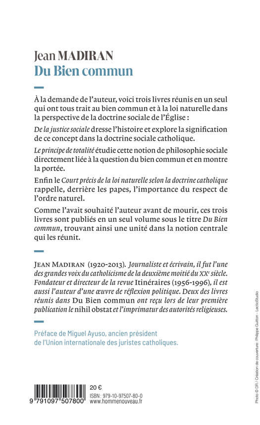 À la demande de l’auteur, voici trois livres réunis en un seul qui ont tous trait au bien commun et à la loi naturelle dans la perspective de la doctrine sociale de l’Église : De la justice sociale dresse l’histoire et explore la signification de ce concept dans la doctrine sociale catholique. Le principe de totalité étudie cette notion de philosophie sociale directement liée à la question du bien commun et en montre la portée. Enfin le Court précis de la loi naturelle selon la doctrine catholique rappelle, derrière les papes, l’importance du respect de l’ordre naturel. Comme l’avait souhaité l’auteur avant de mourir, ces trois livres sont publiés en un seul volume sous le titre Du Bien commun, trouvant ainsi une unité dans la notion centrale qui les réunit.