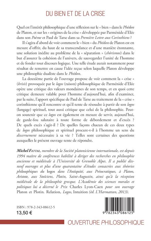 L’intérêt philosophique du présent ouvrage consiste à montrer que la question du Bien évoquée dans le Phédon de Platon va à l’encontre de la conception dualiste que les commentateurs ont soutenu jusqu’à présent. En fait, le Bien du Phédon assurerait l’unité de l’univers et de l’homme, tout en fondant son discours. Par ailleurs, la Crise (séparation) introduite par le logos (raison) philosophique de Parménide et le logos (langage) spirituel de Paul de Tarse apporterait à l’homme un sens critique remettant en cause toute forme de préjugés, et un sens du discernement l’aidant encore aujourd’hui à lutter contre les divisions et les excès pouvant menacer sa vie personnelle et communautaire.