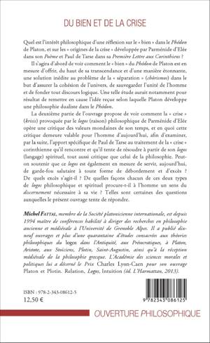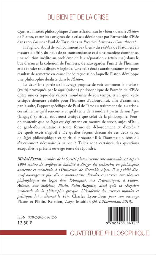 L'intérêt philosophique du présent ouvrage consiste à montrer que la question du Bien évoquée dans le Phédon de Platon va à l'encontre de la conception dualiste que les commentateurs ont soutenu jusqu'à présent. En fait, le Bien du Phédon assurerait l'unité de l'univers et de l'homme, tout en fondant son discours. Par ailleurs, la Crise (séparation) introduite par le logos (raison) philosophique de Parménide et le logos (langage) spirituel de Paul de Tarse apporterait à l'homme un sens critique remettant en cause toute forme de préjugés, et un sens du discernement l'aidant encore aujourd'hui à lutter contre les divisions et les excès pouvant menacer sa vie personnelle et communautaire.