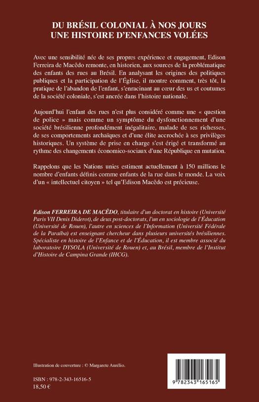 Edison Ferreira de Macêdo remonte, en historien, aux sources de la problématique des enfants des rues au Brésil. En analysant les origines des politiques publiques et la participation de l'Église, il montre comment, très tôt, la pratique de l'abandon de l'enfant, s'enracinant au coeur des us et coutumes de la société coloniale, s'est ancrée dans l'histoire nationale. Aujourd'hui l'enfant des rues n'est plus considéré comme une « question de police » mais comme un symptôme du dysfonctionnement d'une société brésilienne profondément inégalitaire.