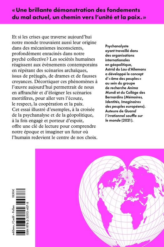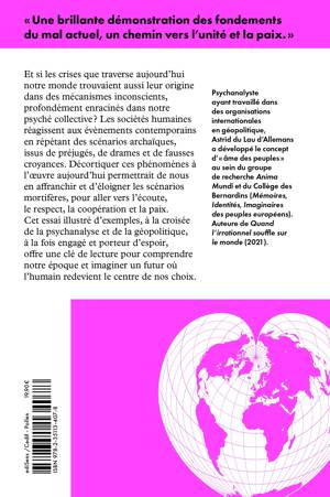 Et si les crises que traverse aujourd’hui notre monde trouvaient aussi leur origine dans des mécanismes inconscients, profondément enracinés dans notre psyché collective ? Cet essai, à la croisée de la psychanalyse, de la géopolitique et de la philosophie, à la fois engagé et porteur d’espoir, offre une clé de lecture pour comprendre notre époque et imaginer un futur où l’humain, dans toute sa complexité, redevient le centre de nos choix. Psychanalyste ayant travaillé dans des organisations internationales en géopolitique, Astrid du Lau d’Allemans pose un regard singulier sur les tensions politiques et sociétales de notre monde. Elle y décèle une “répétition de scénarios” connus dans l’Histoire : montée des populismes, repli sur soi, perte de confiance dans les institutions, résurgence des régimes autoritaires. Plutôt que de se limiter à une analyse politique ou économique classique, elle interroge les racines invisibles de ces phénomènes — celles qui se nichent dans l’ “inconscient collectif”. À l’instar d’un patient en thérapie, les sociétés humaines semblent rejouer, encore et encore, des traumatismes non résolus. Des croyances erronées, héritées du passé, influencent notre manière de percevoir la réalité sans que nous en ayons conscience. Ces "fausses croyances" — sur la sécurité, l’autre, la domination ou encore la peur — génèrent des réflexes de méfiance, d’exclusion ou de violence. Elles se transmettent, s’enracinent, et orientent nos décisions individuelles comme collectives. En étudiant des pays comme la Chine, la Russie, les États-Unis, la Turquie, etc., Astrid du Lau d’Allemans montre comment ces croyances collectives nourrissent les tensions actuelles et entravent toute tentative d’évolution profonde. L’auteure explore différents mécanismes comme celui du cerveau reptilien — ce siège archaïque de la peur et de la survie — qui joue un rôle central en période d’incertitude, il pousse à élire des figures autoritaires censées restaurer une sécurité illusoire. Mais aussi celui de l’ego et ses conséquences collectives : montée de l’hubris, dérives prédatrices, refus de la coopération. L’essai ne se limite pas à un diagnostic. Il propose une véritable voie de transformation, personnelle et collective. Car pour l’auteure, l’espoir réside dans la conscience : comprendre ce qui nous habite [à notre insu], c’est déjà en reprendre le pouvoir. Elle suggère qu’un travail intérieur — individuel, mais aussi collectif à travers la mémoire des peuples — permettrait de sortir des “cycles de répétition”, de s’affranchir du passé, et ouvrirait un espace nouveau de co-construction. Dans ce moment charnière de l’Histoire, où l’ordre mondial hérité de l’après-guerre semble vaciller, l’essai d’Astrid du Lau d’Allemans propose une lecture originale des évènements. Il nous rappelle que tout changement extérieur commence par une transformation intérieure. Dans le cabinet du psychanalyste tout comme sur la scène internationale, ce qui n’est pas vu, entendu, intégré, finit toujours par ressurgir. En proposant cette lecture holistique et systémique des relations internationales l’auteure ouvre une perspective profondément humaniste. Et si, plutôt que de céder à la peur et à la fragmentation, nous choisissions de restaurer l’unité, en nous-mêmes et entre les nations ?