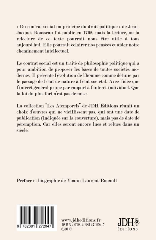 « Du contrat social ou principe de droit politique » de Jean-Jacques Rousseau fut publié en 1762, mais la lecture, ou la relecture de ce texte pourrait nous être utile à tous aujourd'hui. Elle pourrait éclairer nos pensées et aider notre cheminement intellectuel. Le contrat social est un traité de philosophie politique qui a pour ambition de proposer les bases de toutes sociétés modernes. Il présente l'évolution de l'homme comme définie par le passage de l'état de nature à l'état sociétal. Avec l'idée que l'intérêt général prime par rapport à l'intérêt individuel. Que la loi du plus fort n'est pas de mise.
