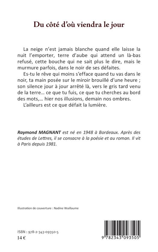 La neige n'est jamais blanche quand elle laisse la nuit l'emporter, terre d'aube qui attend un là-bas refusé, cette bouche qui ne sait plus le dire, mais le murmure parfois, dans le noir de ses défaites. Es-tu le rêve qui moins s'efface quand tu vas dans le noir, ta main posée sur le miroir brouillé d'une heure ; son silence jour à jour arrêté là, vers le gris tard venu de la terre... ce que tu fuis, ce que tu cherches au bord des mots,... hier nos illusions, demain nos ombres. L'ailleurs est ce que défait la lumière.