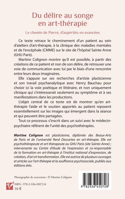 Ce texte retrace le cheminement d'un patient au sein d'ateliers d'art-thérapie, à la clinique des maladies mentales et de l'encéphale (CMME) sur le site de l'hôpital Sainte-Anne (GHU Paris). Martine Colignon montre qu'il est possible, à partir des créations de ce patient et non de son délire, de retrouver une voie de communication avec lui par le biais d'une rencontre entre leurs deux imaginaires. Elle s'appuie sur ses recherches d'artiste plasticienne et son travail psychanalytique avec Henry Bauchau pour choisir ici la voie poétique et littéraire, et non uniquement clinique qui s'intéresserait seulement au symptôme et à ses manifestations dans les productions. L'objet central de ce texte est de montrer qu'en art-thérapie l'aide et le soutien apportés au patient reposent essentiellement sur les images qui émergent dans la séance et qui peuvent être partagées. Tout ce processus s'inscrit dans un suivi avec le médecin-psychiatre référent de l'unité des psychothérapies.
