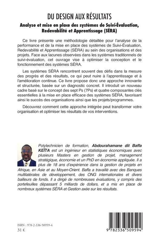 Ce livre présente une méthodologie détaillée pour l'analyse de la performance et de la mise en place des systèmes de Suivi-Évaluation, Redevabilité et Apprentissage (SÉRA) au sein des organisations et des projets. Face aux lacunes observées dans les systèmes traditionnels de suivi-évaluation, cet ouvrage vise à optimiser la conception et le fonctionnement des systèmes SÉRA. Les systèmes SÉRA rencontrent souvent des défi s dans la mesure des progrès et des résultats, ce qui peut nuire à l'apprentissage et à l'amélioration continue. Ce livre propose donc une approche innovante et structurée, basée sur un diagnostic concret. Il introduit un nouveau cadre basé sur le concept des sept Ps (7Ps) et quatre composantes clés essentielles à la mise en place efficace des systèmes SÉRA, favorisant ainsi le succès des organisations ainsi que les projets/programmes. Découvrez comment cette approche intégrée peut transformer votre organisation et optimiser les résultats de vos interventions.
