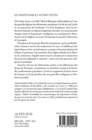 Né à Alep, Syrie, en 1849, ‘Abd al-Rahmân al-Kawâkibî est l'une des grandes figures du réformisme musulman à la fin du xixe siècle et un précurseur de l'arabisme. Ce livre fondateur, dont la traduction française est depuis longtemps attendue, est une puissante charge contre le despotisme, soulignant ses conséquences désastreuses sur la religion, le savoir, l'économie, la morale, l'éducation et le progrès.