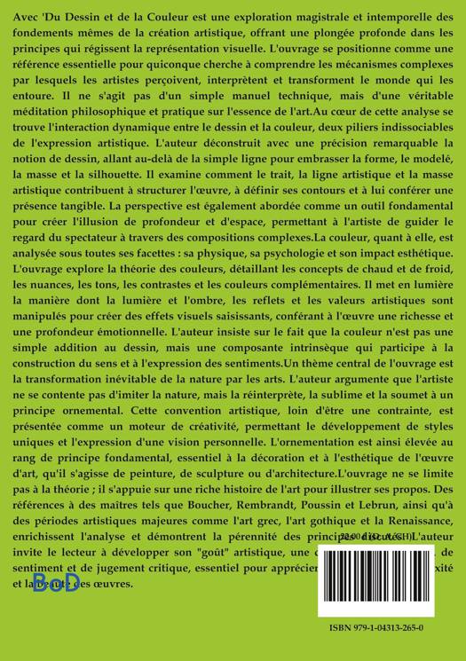 Avec 'Du Dessin et de la Couleur est une exploration magistrale et intemporelle des fondements mêmes de la création artistique, offrant une plongée profonde dans les principes qui régissent la représentation visuelle. L'ouvrage se positionne comme une référence essentielle pour quiconque cherche à comprendre les mécanismes complexes par lesquels les artistes perçoivent, interprètent et transforment le monde qui les entoure. Il ne s'agit pas d'un simple manuel technique, mais d'une véritable méditation philosophique et pratique sur l'essence de l'art.Au coeur de cette analyse se trouve l'interaction dynamique entre le dessin et la couleur, deux piliers indissociables de l'expression artistique. L'auteur déconstruit avec une précision remarquable la notion de dessin, allant au-delà de la simple ligne pour embrasser la forme, le modelé, la masse et la silhouette. Il examine comment le trait, la ligne artistique et la masse artistique contribuent à structurer l'oeuvre, à définir ses contours et à lui conférer une présence tangible. La perspective est également abordée comme un outil fondamental pour créer l'illusion de profondeur et d'espace, permettant à l'artiste de guider le regard du spectateur à travers des compositions complexes.La couleur, quant à elle, est analysée sous toutes ses facettes : sa physique, sa psychologie et son impact esthétique. L'ouvrage explore la théorie des couleurs, détaillant les concepts de chaud et de froid, les nuances, les tons, les contrastes et les couleurs complémentaires. Il met en lumière la manière dont la lumière et l'ombre, les reflets et les valeurs artistiques sont manipulés pour créer des effets visuels saisissants, conférant à l'oeuvre une richesse et une profondeur émotionnelle. L'auteur insiste sur le fait que la couleur n'est pas une simple addition au dessin, mais une composante intrinsèque qui participe à la construction du sens et à l'expression des sentiments.Un thème central de l'ouvrage est la transformation inévitable de la nature par les arts. L'auteur argumente que l'artiste ne se contente pas d'imiter la nature, mais la réinterprète, la sublime et la soumet à un principe ornemental. Cette convention artistique, loin d'être une contrainte, est présentée comme un moteur de créativité, permettant le développement de styles uniques et l'expression d'une vision personnelle. L'ornementation est ainsi élevée au rang de principe fondamental, essentiel à la décoration et à l'esthétique de l'oeuvre d'art, qu'il s'agisse de peinture, de sculpture ou d'architecture.L'ouvrage ne se limite pas à la théorie ; il s'appuie sur une riche histoire de l'art pour illustrer ses propos. Des références à des maîtres tels que Boucher, Rembrandt, Poussin et Lebrun, ainsi qu'à des périodes artistiques majeures comme l'art grec, l'art gothique et la Renaissance, enrichissent l'analyse et démontrent la pérennité des principes discutés. L'auteur invite le lecteur à développer son "goût" artistique, une combinaison de savoir, de sentiment et de jugement critique, essentiel pour apprécier pleinement la complexité et la beauté des oeuvres.
