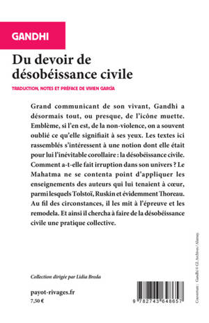 Grand communicant de son vivant, Gandhi a désormais tout, ou presque, de l'icône muette. Emblème, si l'en est, de la non-violence, on a souvent oublié ce qu'elle signifiait à ses yeux. Les textes ici rassemblés s'intéressent à une notion dont elle était pour lui l'inévitable corollaire : la désobéissance civile. Comment a-t-elle fait irruption dans son univers ? Comment a-t-elle été transformée et absorbée par celui-ci, en pratique comme en théorie ? Le Mahatma ne se contenta point d'appliquer les enseignements des auteurs qui lui tenaient à coeur, parmi lesquels Tolstoï, Ruskin et évidemment Thoreau. Au fil des circonstances, il les mit à l'épreuve et les remodela. Et ainsi il chercha, non sans grandes difficultés, à faire de la désobéissance civile une pratique collective et à essayer de la disjoindre absolument de toute violence.