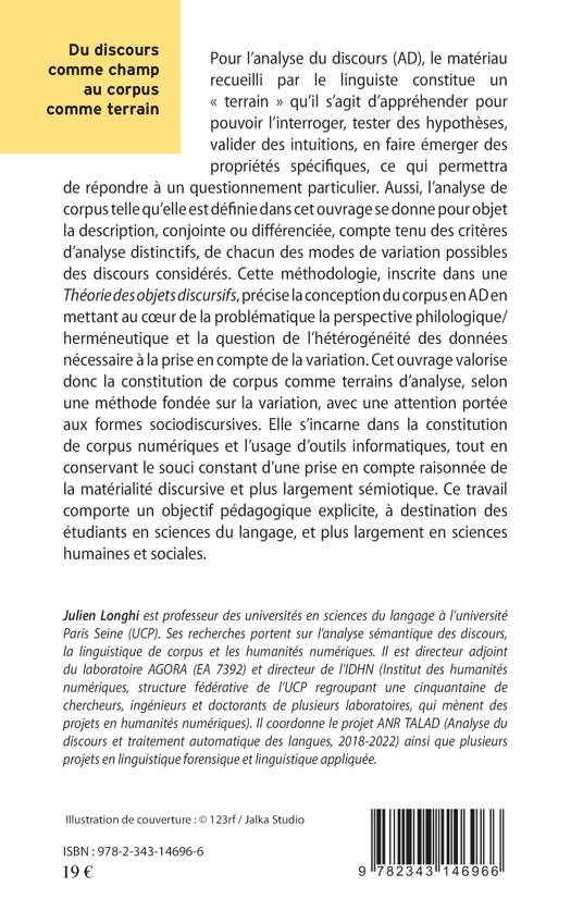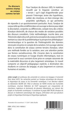 Pour l'analyse du discours, le matériau recueilli par le linguiste constitue un « terrain » qu'il s'agit d'appréhender pour pouvoir l'interroger. Cet ouvrage valorise donc la constitution de corpus comme terrains d'analyse, selon une méthode fondée sur la variation, avec une attention portée aux formes sociodiscursives. Elle s'incarne dans la constitution de corpus numériques et l'usage d'outils informatiques, tout en conservant le souci constant d'une prise en compte raisonnée de la matérialité discursive et plus largement sémiotique.
