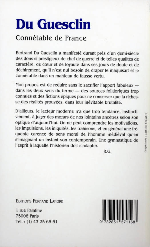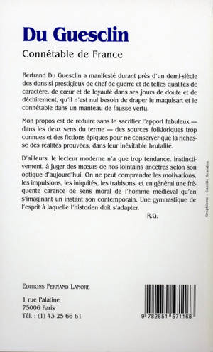 Bertrand du Guesclin a manifesté durant près d’un demi-siècle des dons si prestigieux de chef de guerre et de telles qualités de caractère, de cœur et de loyauté dans ses jours de doute et de déchirement, qu’il n’est nul besoin de draper le maquisard et le connétable dans un manteau de fausse vertu.