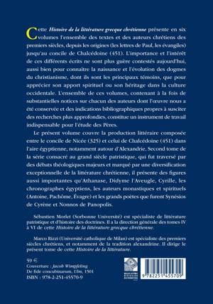 Cette Histoire de la litterature grecque chretienne presente en six volumes l'ensemble des textes et des auteurs chretiens des premiers siecles, depuis les origines (les lettres de Paul, les evangiles) jusqu'au concile de Chalcedoine (451). L'importance et l'interet de ces differents ecrits ne sont plus guere contestes aujourd'hui, aussi bien pour connaitre la naissance et l'evolution des dogmes du christianisme, dont ils sont les principaux temoins, que pour apprecier son apport spirituel ou son heritage dans la culture occidentale. L'ensemble de ces volumes, contenant a la fois de substantielles notices sur chacun des auteurs dont l'oeuvre nous a ete conservee et des indications bibliographiques propres a susciter des recherches plus approfondies, constitue un instrument de travail indispensable pour l'etude des Peres. Le present volume couvre la production litteraire composee entre le concile de Nicee (325) et celui de Chalcedoine (451) dans l'aire egyptienne, notamment autour d'Alexandrie. Second tome de la serie consacre au grand siecle patristique, qui fut traverse par des debats theologiques majeurs et marque par une diversification exceptionnelle de la litterature chretienne, il presente des figures aussi importantes qu'Athanase, Didyme l'Aveugle, Cyrille, les chronographes egyptiens, les auteurs monastiques et spirituels (Antoine, Pachome, Evagre) et les grands poetes que furent Synesios de Cyrene et Nonnos de Panopolis.