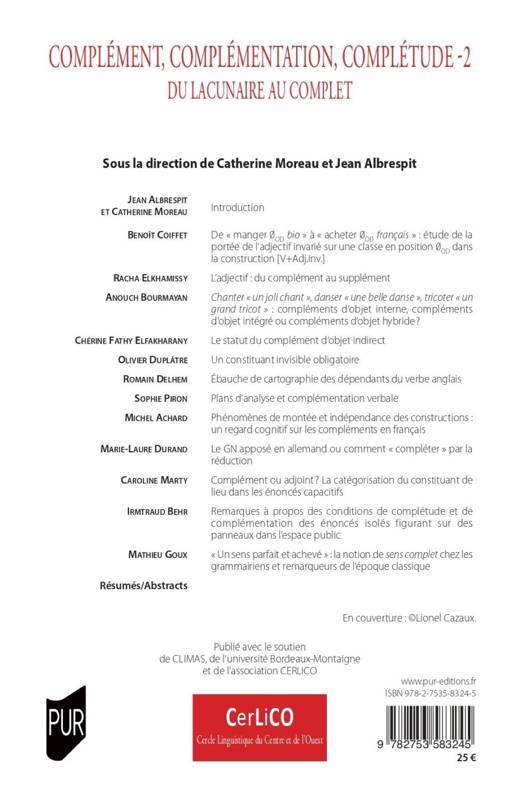 Si la notion de complément est relativement récente, la notion de complétude est beaucoup plus ancienne. On trouve déjà chez les grammairiens grecs le terme d’autoteleia, qui réfère à cette propriété à la fois syntaxique et sémantique que doivent comporter les énoncés bien formés. Curieusement, cette notion est inséparable d’une autre, apparue presque simultanément : celle d’ellipse (elleipsis), qui, tout en désignant littéralement le manque, délimite précisément la nature de ce qui manque et remplit paradoxalement ce manque. Les articles qui composent ce volume interrogent justement ce jeu de miroir entre les lacunes de l’expression et la complétude à laquelle elles renvoient nécessairement.