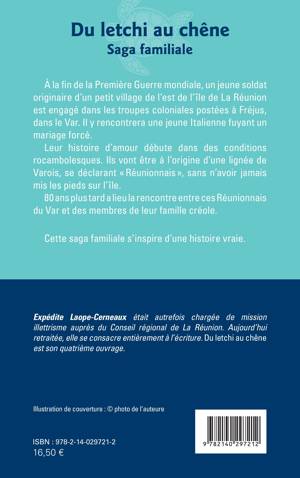 Du letchi au chêne Saga familiale À la fin de la Première Guerre mondiale, un jeune soldat originaire d'un petit village de l'est de l'île de La Réunion est engagé dans les troupes coloniales postées à Fréjus, dans le Var. Il y rencontrera une jeune Italienne fuyant un mariage forcé. Leur histoire d'amour débute dans des conditions rocambolesques. Ils vont être à l'origine d'une lignée de Varois, se déclarant Réunionnais, sans n'avoir jamais mis les pieds sur l'île. 80 ans plus tard a lieu la rencontre entre ces Réunionnais du Var et des membres de leur famille créole. Cette saga familiale s'inspire d'une histoire vraie. Expédite Laope-Cerneaux était autrefois chargée de mission illettrisme auprès du Conseil régional de La Réunion. Aujourd'hui retraitée, elle se consacre entièrement à l'écriture. Du letchi au chêne est son quatrième ouvrage.