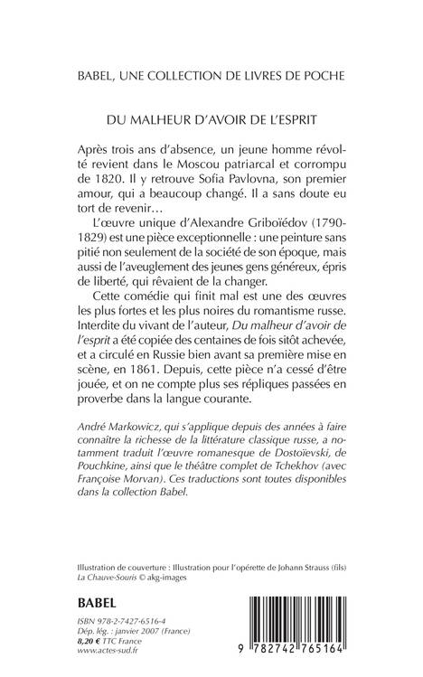 Après trois ans d'absence, un jeune homme révolté revient dans le Moscou patriarcal et corrompu de 1820. Il y retrouve Sofia Pavlovna, son premier amour, qui a beaucoup changé. Il a sans doute eu tort de revenir... L'oeuvre unique d'Alexandre Griboïédov (1790-1829) est une pièce exceptionnelle : une peinture sans pitié non seulement de la société de son époque, mais aussi de l'aveuglement des jeunes gens généreux, épris de liberté, qui rêvaient de la changer. Cette comédie qui finit mal est une des oeuvres les plus fortes et les plus noires du romantisme russe. Interdite du vivant de l'auteur, Du malheur d'avoir de l'esprit a été copiée des centaines de fois sitôt achevée, et a circulé en Russie bien avant sa première mise en scène, en 1861. Depuis, cette pièce n'a cessé d'être jouée, et on ne compte plus ses répliques passées en proverbe dans la langue courante.