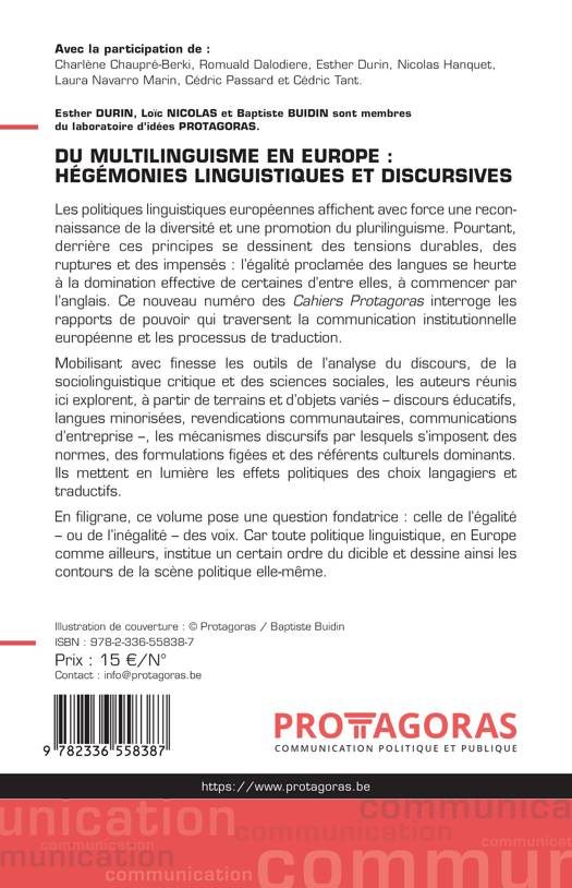 Les politiques linguistiques européennes affichent avec force une reconnaissance de la diversité et une promotion du plurilinguisme. Pourtant, derrière ces principes se dessinent des tensions durables, des ruptures et des impensés: l'égalité proclamée des langues se heurte à la domination effective de certaines d'entre elles, à commencer par l'anglais. Ce nouveau numéro des Cahiers Protagoras interroge les rapports de pouvoir qui traversent la communication institutionnelle européenne et les processus de traduction. Mobilisant avec finesse les outils de l'analyse du discours, de la sociolinguistique critique et des sciences sociales, les auteurs réunis ici explorent, à partir de terrains et d'objets variés - discours éducatifs, langues minorisées, revendications communautaires, communications d'entreprise -, les mécanismes discursifs par lesquels s'imposent des normes, des formulations figées et des référents culturels dominants. Ils mettent en lumière les effets politiques des choix langagiers et traductifs. En filigrane, ce volume pose une question fondatrice: celle de l'égalité - ou de l'inégalité - des voix. Car toute politique linguistique, en Europe comme ailleurs, institue un certain ordre du dicible et dessine ainsi les contours de la scène politique elle-même.