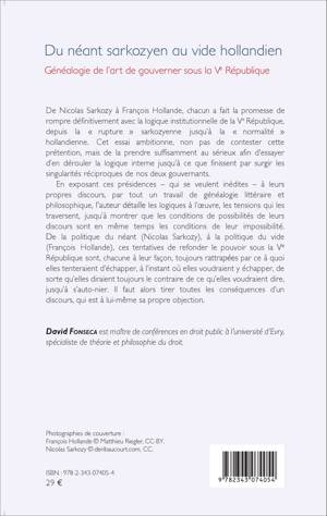 Nicolas Sarkozy et François Hollande ont tous deux voulu refonder le pouvoir sous la Ve République. Sans contester cette prétention, cet essai essaye d'en dérouler la logique interne pour en faire surgir les singularités et contradictions. L'auteur expose ces présidences à leur propres discours et détaille les tensions qui les entourent. De la politique du néant à la politique du vide, ces tentatives de refonder le pouvoir sont toujours rattrapées par ce à quoi elles tenteraient d'échapper.