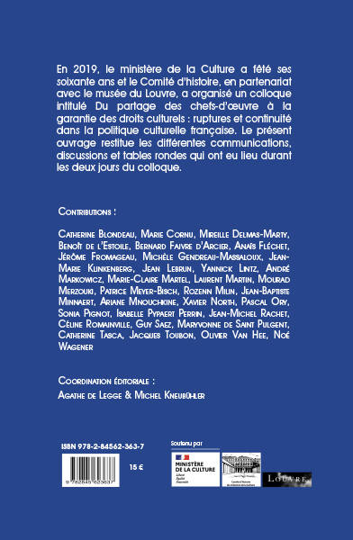 En 2019, le ministère de la Culture a fêté ses soixante ans et le Comité d’histoire, en partenariat avec le musée du Louvre, a organisé un colloque intitulé Du partage des chefs-d’œuvre à la garantie des droits culturels : ruptures et continuité dans la politique culturelle française. Le présent ouvrage restitue les différentes communications, discussions et tables rondes qui ont eu lieu durant les deux jours du colloque, les 19 et 20 décembre 2019..