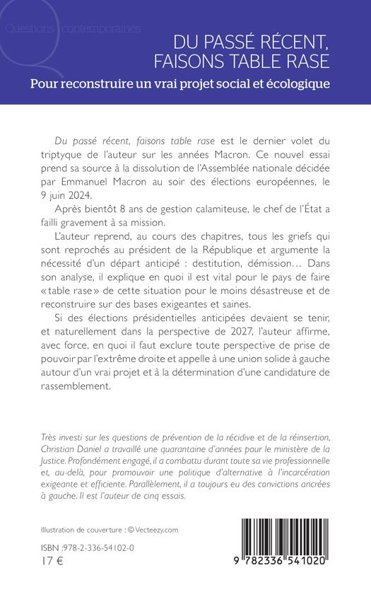 Du passé récent, faisons table rase est le dernier volet du triptyque de l'auteur sur les années Macron. Ce nouvel essai prend sa source à la dissolution de l'Assemblée nationale décidée par Emmanuel Macron au soir des élections européennes, le 9 juin 2024. Après bientôt 8 ans de gestion calamiteuse, le chef de l'État a failli gravement à sa mission. L'auteur reprend, au cours des chapitres, tous les griefs qui sont reprochés au président de la République et argumente la nécessité d'un départ anticipé destitution, démission... Dans son analyse, il explique en quoi il est vital pour le pays de faire table rase de cette situation pour le moins désastreuse et de reconstruire sur des bases exigeantes et saines. Si des élections présidentielles anticipées devaient se tenir, et naturellement dans la perspective de 2027, l'auteur affirme, avec force, en quoi il faut exclure toute perspective de prise de pouvoir par l'extrême droite et appelle à une union solide à gauche autour d'un vrai projet et à la détermination d'une candidature de rassemblement.