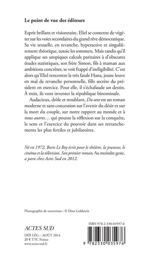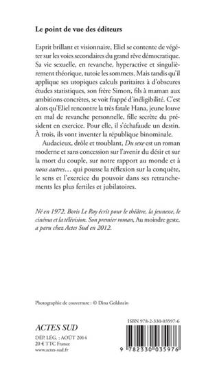 Audacieux, drôle et troublant, «Du sexe» est un roman moderne et sans concession sur l'avenir du désir et sur la mort du couple, sur notre rapport au monde et à «nous autres»... qui pousse la réflexion sur la conquête, le sens et l'exercice du pouvoir dans ses retranchements les plus fertiles et jubilatoires.