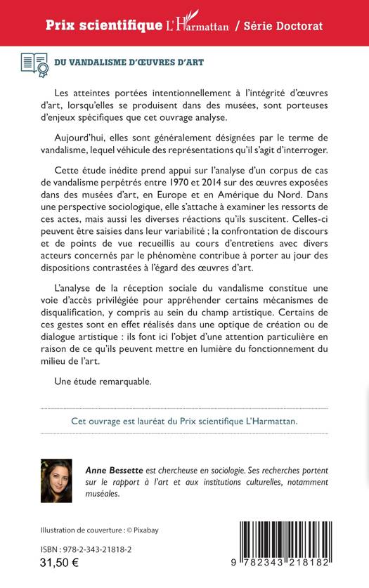 Les atteintes portées intentionnellement à l’intégrité d’oeuvres d’art, lorsqu’elles se produisent dans des musées, sont porteuses d’enjeux spécifiques que cet ouvrage analyse. Aujourd’hui, elles sont généralement désignées par le terme de vandalisme, lequel véhicule des représentations qu’il s’agit d’interroger. Cette étude inédite prend appui sur l’analyse d’un corpus de cas de vandalisme perpétrés entre 1970 et 2014 sur des oeuvres exposées dans des musées d’art, en Europe et en Amérique du Nord. Dans une perspective sociologique, elle s’attache à examiner les ressorts de ces actes, mais aussi les diverses réactions qu’ils suscitent. L’analyse de la réception sociale du vandalisme constitue une voie d’accès privilégiée pour appréhender certains mécanismes de disqualification, y compris au sein du champ artistique. Certains de ces gestes sont en effet réalisés dans une optique de création ou de dialogue artistique : ils font ici l’objet d’une attention particulière en raison de ce qu’ils peuvent mettre en lumière du fonctionnement du milieu de l’art.