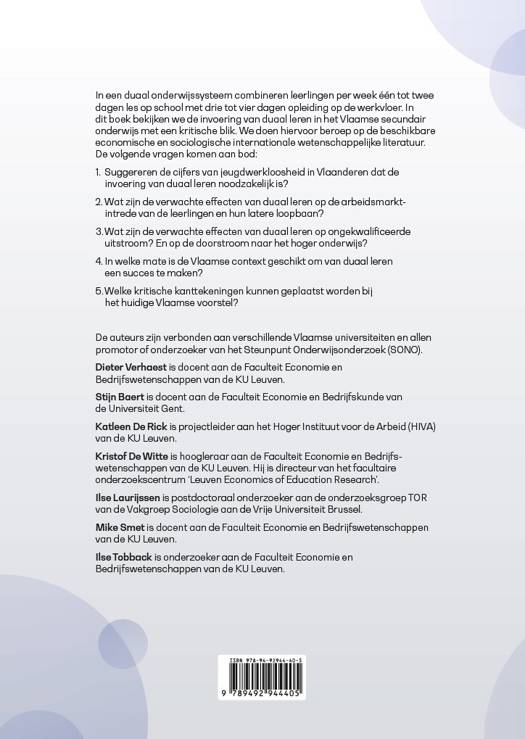 In een duaal onderwijssysteem combineren leerlingen per week één tot twee dagen les op school met drie tot vier dagen opleiding op de werkvloer. In dit boek bekijken we de invoering van duaal leren in het Vlaamse secundair onderwijs met een kritische blik. We doen hiervoor beroep op de beschikbare economische en sociologische internationale wetenschappelijke literatuur. De volgende vragen komen aan bod: (1) Suggereren de cijfers van jeugdwerkloosheid in Vlaanderen dat de invoering van duaal leren noodzakelijk is? (2) Wat zijn de verwachte effecten van duaal leren op de arbeidsmarktintrede van de leerlingen en hun latere loopbaan? (3) Wat zijn de verwachte effecten van duaal leren op ongekwalificeerde uitstroom? En op de doorstroom naar het hoger onderwijs? (4) In welke mate is de Vlaamse context geschikt om van duaal leren een succes te maken? (5) Welke kritische kanttekeningen kunnen geplaatst worden bij het huidige Vlaamse voorstel?