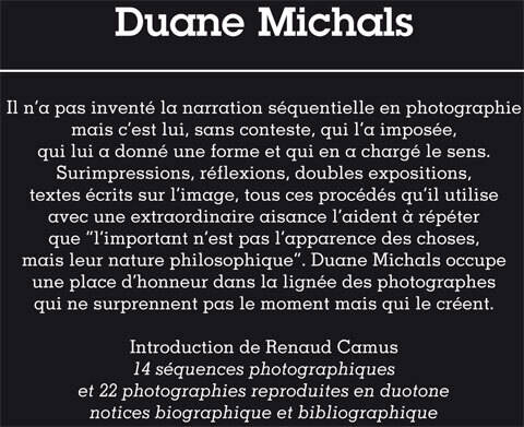 Il n'a pas inventé la narration séquentielle en photographie mais c'est lui, sans conteste, qui l'a imposée, qui lui a donné une forme et qui en a chargé le sens. Surimpressions, réflexions, doubles expositions, textes écrits sur l'image, tous ces procédés qu'il utilise avec une extraordinaire aisance l'aident à répéter que "l'important n'est pas l'apparence des choses, mais leur nature philosophique". Duane Michals occupe une place d'honneur dans la lignée des photographes qui ne surprennent pas le moment mais qui le créent. Introduction de Renaud Camus 14 séquences photographiques et 22 photographies reproduites en duotone.