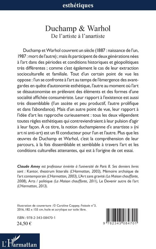 Duchamp et Warhol couvrent un siècle (1887 : naissance de l'un, 1987 : mort de l'autre) ; mais ils participent de deux générations nées à l'art dans des périodes et conditions historiques et géopolitiques très différentes. Tout d'un certain point de vue les oppose : l'un se confronte à l'art au temps de l'émergence des avant-gardes en quête d'autonomie esthétique, l'autre au moment où l'art se désautonomise en prélevant des éléments et des formes d'une socialité affichée consumériste. Plus que leurs œuvres, c'est la compréhension de leur parcours, à la fois semblable et dissemblable, qui est à l'origine de cet essai.