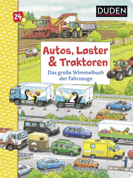 Auf großen Wimmelseiten rund um Autobahn, Baustelle, Bauernhof und Rettungsaktion erkennt man immer wieder neue Dinge. Auf weiteren Seiten staunt man über die groß abgebildeten Fahrzeuge, bei denen wirklich jedes Detail zu sehen ist.