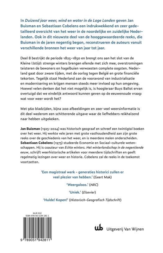 In Duizend jaar weer, wind, en water in de Lage Landen, deel 8, geven Jan Buisman en Sebastiaan Cobelens een indrukwekkend en zeer gedetailleerd overzicht van het weer in de noordelijke en zuidelijke Nederlanden, in de periode 1825-1850. Het is het nieuwste deel van de hoog gewaardeerde reeks, die Buisman (1925-2024) in de jaren negentig begon, waarin hij vanuit verschillende bronnen het weer van jaar tot jaar reconstrueert. Deel 8 brengt ons aan het slot van de Kleine IJstijd: strenge winters brengen ellende met zich mee, overstromingen teisteren de bewoners en hagelbuien verwoesten complete oogsten. Nederland gaat door zware tijden, met de oorlog tegen België en grote financiële tekorten. Tegelijk staat Nederland aan de vooravond van industrialisatie en modernisering en krijgen mensen steeds meer invloed op hun omgeving. Hoewel velen denken dat het niet mogelijk is, is hoogleraar Buys Ballot ervan overtuigd dat we eindelijk antwoord kunnen geven op de eeuwenoude vraag: wat voor weer wordt het? Opnieuw een schitterend deel in de reeks waar de liefhebbers reikhalzend naar hebben uitgekeken.