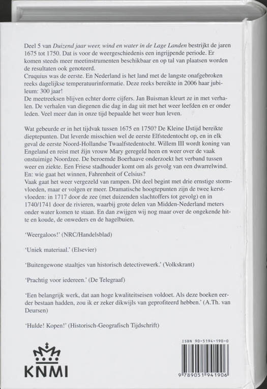 Van het grote werk van Jan Buisman, 'Duizend jaar weer, wind en water in de Lage Landen', is dit het vijfde deel. Het is een geweldig werk, en de periode 1675 tot 1750 was in veel opzichten zeer bewerkelijk. Vooral het feit dat er in deze periode meetapparatuur voor temperatuur en luchtdruk ontstaat maakt dit deel complex. Want de meetreeksen uit het begin van de zogenaamde instrumentele periode zijn vaak moeilijk te interpreteren. De cijfers van mannen als Fahrenheit, Celsius, Eckhardt en Cruquius moeten soms cijfer voor cijfer zorgvuldig omgerekend worden.