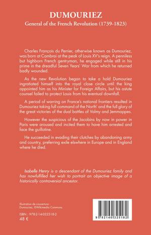 Charles François du Perrier, otherwise known as Dumouriez, was born at Cambrai at the peak of Louis XV's reign. A penniless but highborn French gentryman, he engaged while still in his prime in the dreadful Seven Years' War from which he returned badly wounded. As the new Revolution began to take a hold Dumouriez ingratiated himself into the royal close circle until the king appointed him as his Minister for Foreign Affairs, but his astute counsel failed to protect Louis from his eventual downfall. A period of warring on France's national frontiers resulted in Dumouriez taking full command of the North' and the full glory of the great victories of the dual battles of Valmy and Jemmappes. However the suspicious of the Jacobins by now in power in Paris were aroused and incited them to have him arrested and face the guillotine. He succeeded in evading their clutches by abandoning army and country, preferring exile elswhere in Europe and in England where he died.