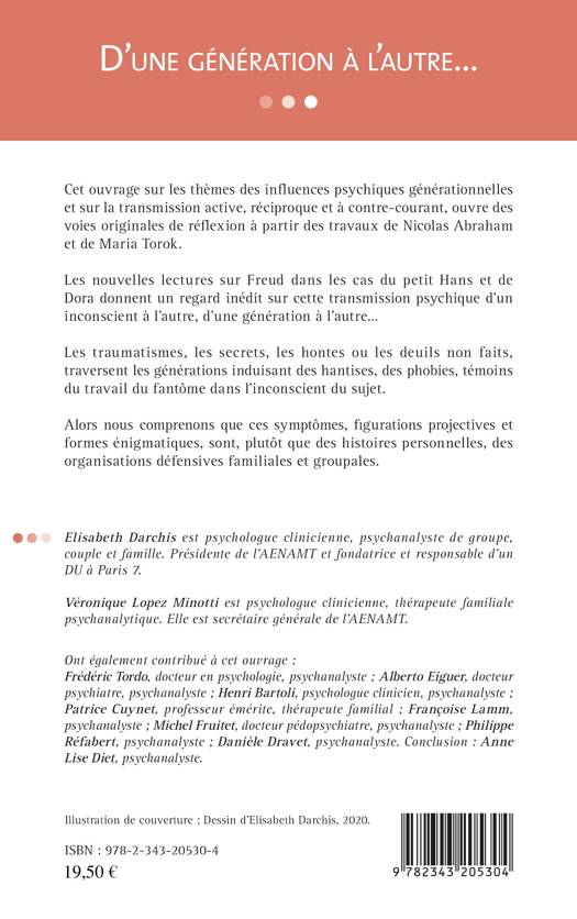 Cet ouvrage sur les thèmes des influences psychiques générationnelles et sur la transmission active, réciproque et à contre-courant, ouvre des voies originales de réflexion à partir des travaux de Nicolas Abraham et de Maria Torok. Les nouvelles lectures sur Freud dans les cas du petit Hans et de Dora donnent un regard inédit sur cette transmission psychique d'un inconscient à l'autre, d'une génération à l'autre... Les traumatismes, les secrets, les hontes ou les deuils non faits, traversent les générations induisant des hantises, des phobies, témoins du travail du fantôme dans l'inconscient du sujet.
