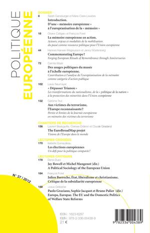 Au sommaire de ce numéro : La mémoire européenne en action / Commemorating Europe ? / Des usages politiques du musée à l'échelle européenne / "Dépasser Trianon" / Aux victimes du terrorisme, l'Europe reconnaissante ? / The EuroBroadMap projet / Les élections européennes.