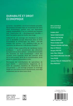 L'objectif de ce colloque a été d'étudier le poids qu'occupe désormais la durabilité dans notre droit économique et d'observer si, à son contact, ce dernier évolue, s'améliore, voire se pervertit. Divers textes la mentionnent, notamment des directives européennes ou des textes de soft law. Surtout, les principales branches du droit économique semblent touchées par sa percée : droit des sociétés, droit financier, droit des contrats, droit de la concurrence, droit de la consommation, droit pénal, et procédure civile. Les interventions de spécialistes de haut niveau (universitaires, magistrat de la Cour de cassation ou membre de l'Autorité de la concurrence) permettent d'éclairer le public sur un mot encore bien mystérieux, mais d'ores et déjà bien enraciné dans notre Droit.