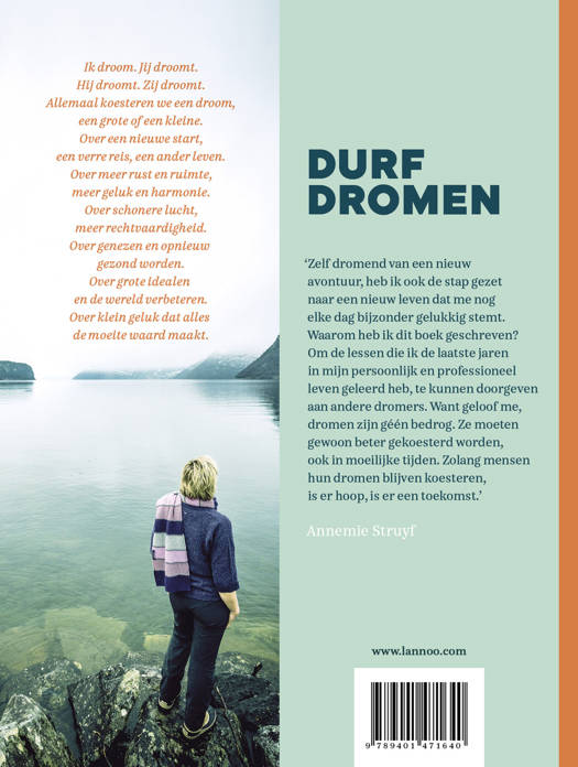 'Zelf dromend van een nieuw avontuur, heb ik ook de stap gezet naar een nieuw leven dat me nog elke dag bijzonder gelukkig stemt. Waarom heb ik dit boek geschreven? Om de lessen die ik de laatste jaren in mijn persoonlijk en professioneel leven geleerd heb, te kunnen doorgeven aan andere dromers. Want geloof me, dromen zijn géén bedrog. Ze moeten gewoon beter gekoesterd worden, ook in moeilijke tijden. Zolang mensen hun dromen blijven koesteren, is er hoop, is er een toekomst.' Annemie Struyf
