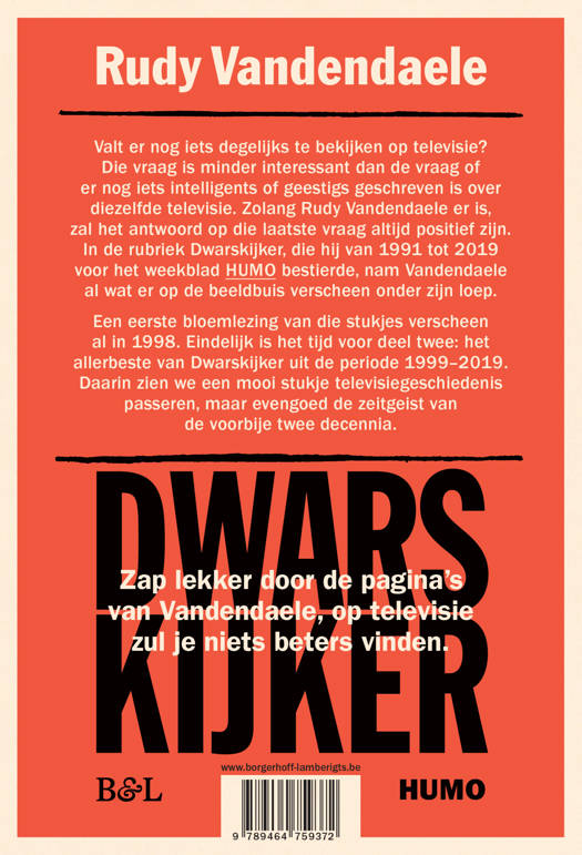 In de rubriek Dwarskijker, die hij van 1991 tot 2019 voor het weekblad HUMO bestierde, nam Vandendaele al wat op de beeldbuis verscheen op bijzonder intelligente en geestige wijze onder de loep. Een eerste bloemlezing van die stukjes verscheen al in 1998. Eindelijk is het tijd voor deel twee: het allerbeste van Dwarskijker uit de periode 1999-2019. Dat levert een boek op van het hoogste literaire niveau, maar evengoed is het een stukje televisiegeschiedenis en het harde bewijs dat de Dwarskijker-recensie áltijd beter is dan het programma zelf. Zap lekker door de pagina’s van Vandendaele, op televisie zal je niets beters vinden.