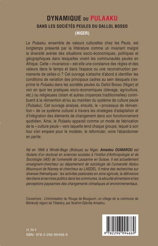 Cet ouvrage s'attache d'abord à identifier les conditions de variation des principaux cadres au sein desquels s'exprime le Pulaaku dans les sociétés peules du Dallol Bosso (Niger) et voir en quoi les pratiques socio-économiques ou religieuses contribuent à la réinvention et/ou au maintien du système de culture peule. Il analyse ensuite le "processus de réinvention" de ce système culturel à travers les stratégies d'adaptation et d'intégration des éléments de changement dans son fonctionnement quotidien.