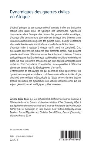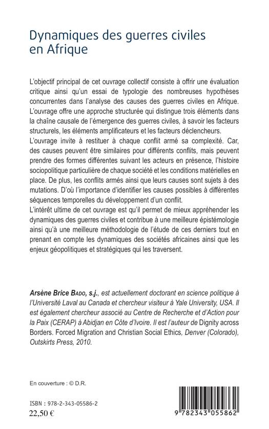 Cet ouvrage offre un essai de typologie des nombreuses hypothèses concurrentes dans l'analyse des causes des guerres civiles en Afrique. Il distingue 3 éléments dans la chaîne causale de leur émergence : les facteurs structurels, les éléments amplificateurs et les facteurs déclencheurs. Si les causes peuvent être similaires pour certains conflits, il restitue à chacun sa complexité selon les acteurs en présence, l'histoire sociopolitique particulière des sociétés et les conditions matérielles.