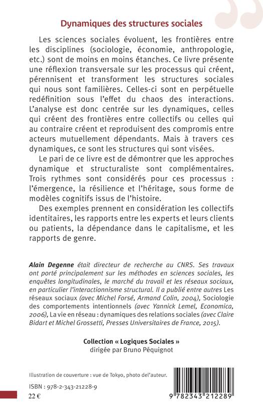 Les sciences sociales évoluent, les frontières entre les disciplines (sociologie, économie, anthropologie, etc.) sont de moins en moins étanches. Ce livre présente une réflexion transversale sur les processus qui créent, pérennisent et transforment les structures sociales qui nous sont familières. Celles-ci sont en perpétuelle redéfinition sous l'effet du chaos des interactions. L'analyse est donc centrée sur les dynamiques, celles qui créent des frontières entre collectifs ou celles qui au contraire créent et reproduisent des compromis entre acteurs mutuellement dépendants.