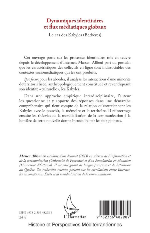 Cet ouvrage porte sur les processus identitaires mis en oeuvre depuis le développement d'Internet. Massen Allioui part du postulat que les caractéristiques des collectifs en ligne sont indissociables des contextes sociomédiatiques qui les ont produits. Ipso facto, pour les aborder, il analyse les interactions d'une minorité déterritorialisée, anthropologiquement constituée et revendiquant son identité culturelle, les Kabyles. Dans une approche empirique interdisciplinaire, l'auteur les questionne et y apporte des réponses dans une démarche compréhensive qui tient compte de la relation qu'entretiennent les Kabyles avec le pouvoir, la mémoire et le territoire. Il réinterroge ensuite les théories de la mondialisation de la communication à la lumière de cette nouvelle donne introduite par les flux globaux.