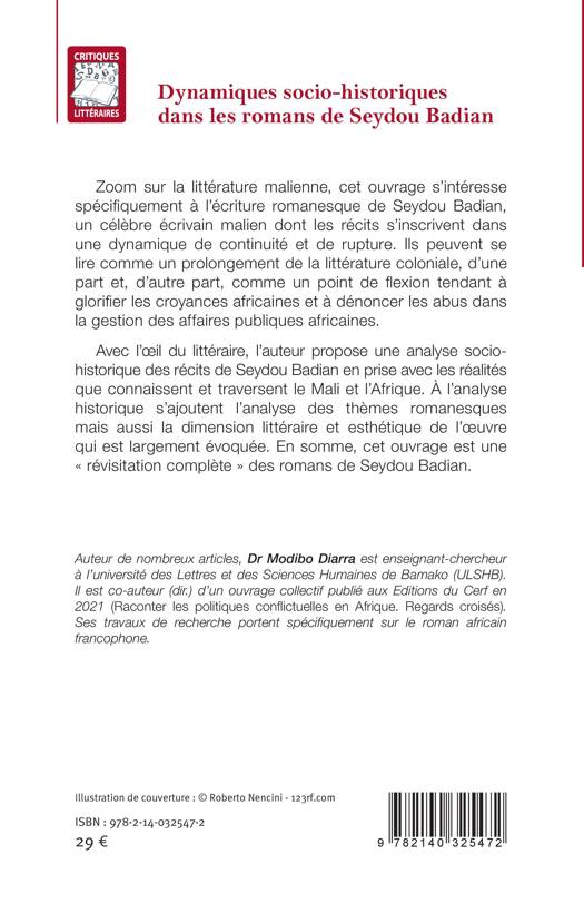 Zoom sur la littérature malienne, cet ouvrage s'intéresse Spécifiquement à l'écriture romanesque de Seydou Badian, un célèbre écrivain malien dont les récits s'inscrivent dans une dynamique de continuité et de rupture. Ils peuvent se lire comme un prolongement de la littérature coloniale, d'une part et, d'autre part, comme un point de réflexion tendant à glorifier les croyances africaines et à dénoncer les abus dans la gestion des affaires publiques africaines. Avec l'oeil du littéraire, l'auteur propose une analyse sociohistorique des récits de Seydou Badian en prise avec les réalités que connaissent et traversent le Mali et l'Afrique. À l'analyse historique s'ajoutent l'analyse des thèmes romanesques mais aussi la dimension littéraire et esthétique de l'oeuvre qui est largement évoquée. En somme, cet ouvrage est une re-visitation complète des romans de Seydou Badian.