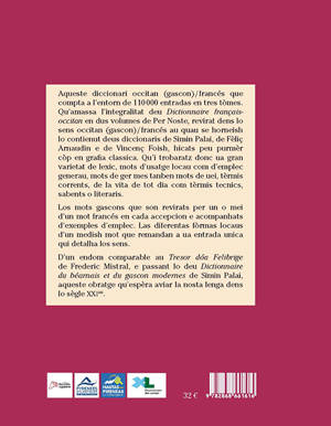 Aqueste diccionari occitan (gascon) / francés que compta a l’entorn de 110 000 entradas en tres tòmes. Qu’amassa l’integralitat deu Dictionnaire français-occitan en dus volumes de Per Noste, revirat dens lo sens occitan (gascon) / francés au quau se horneish lo contienut deus diccionaris de Simin Palai, de Fèliç Arnaudin e de Vincenç Foish, hicats peu purmèr còp en grafia classica. Qu’i trobaratz donc ua gran varietat de lexic, mots d’usatge locau com d’emplec generau, mots de ger mes tanben mots de uei, tèrmis corrents, de la vita de tot dia com tèrmis tecnics, sabents o literaris.