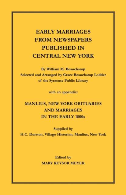 Edited by Mary Keysor Meyer. This work contains early 1800s marriages from various newspapers in Auburn, Onondaga Hill, Onondaga Hollow, Skaneateles, and Syracuse, which covered the counties of Cayuga, Cortland, Madison, Onondaga, and Oswego. Obituaries a